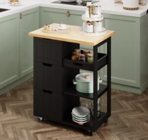 A rolling cart adds extra space and can be tucked away when not in use. It’s a mobile solution for a flexible kitchen design to maximize space.