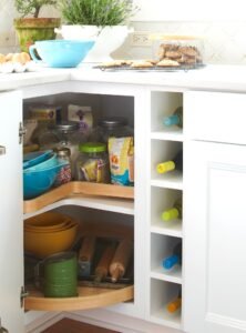 Lazy Susans or corner drawers make use of awkward spaces that usually go unused. This idea can dramatically increase your storage.