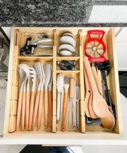 Hang your pots, pans, and utensils instead of stacking them. A wall mounted rack or magnetic knife strip can work wonders in organizing your kitchen.